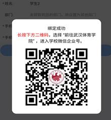 2.绑定手机号:身份认证成功后,进行认证界面,输入与微信绑定的手机号,点击“绑定”,成功后将提示绑定成功,并弹出“武汉体育学院”企业号二维码;