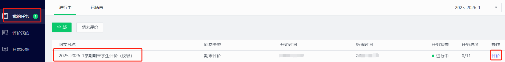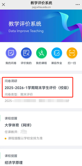 4.进入教评系统:点击【教学评价系统】即可进行评价主页,直接点击首页2025-2026-1学生期末评价问卷,进行评价。