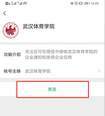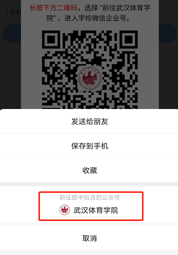 3.关注企业号:长按图中企业号二维码,点击“关注”,进入“武汉体育学院”。