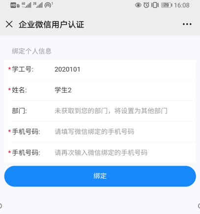 2.绑定手机号:身份认证成功后,进行认证界面,输入与微信绑定的手机号,点击“绑定”,成功后将提示绑定成功,并弹出“武汉体育学院”企业号二维码;