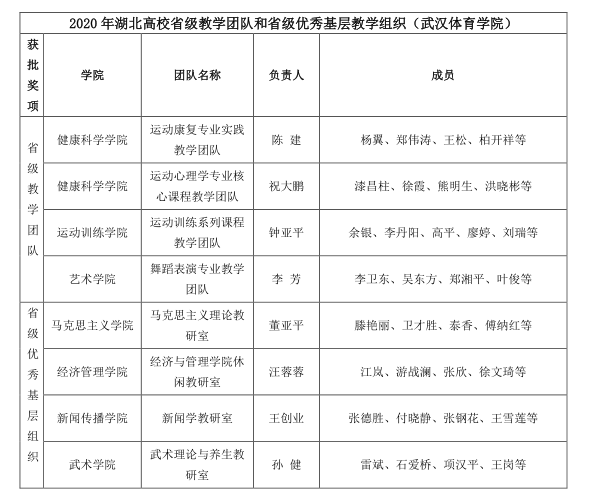 (通讯员 汪凌云)近日,湖北省教育厅公布了2020年湖北高校省级教学团队和2020年湖北高校省级优秀基层教学组织评审结果。我校运动康复专业实践教学团队、运动心理学专业核心课程教学团队、运动训练系列课程教学团队、舞蹈表演专业教学团队等4个教学团队获评湖北高校省级教学团队;马克思主义理论教研室、经济与管理学院休闲教研室、新闻学教研室、武术理论与养生教研室等4个教学组织获评湖北高校省级优秀基层教学组织。
