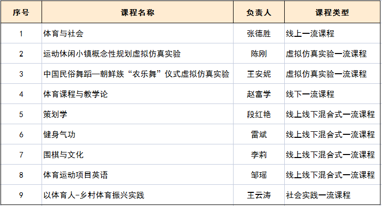 (通讯员 汪凌云)近日,湖北省教育厅公布《省教育厅关于公布2021年度省级一流本科课程认定结果的通知》,武汉体育学院9门课程获批省级一流本科课程。