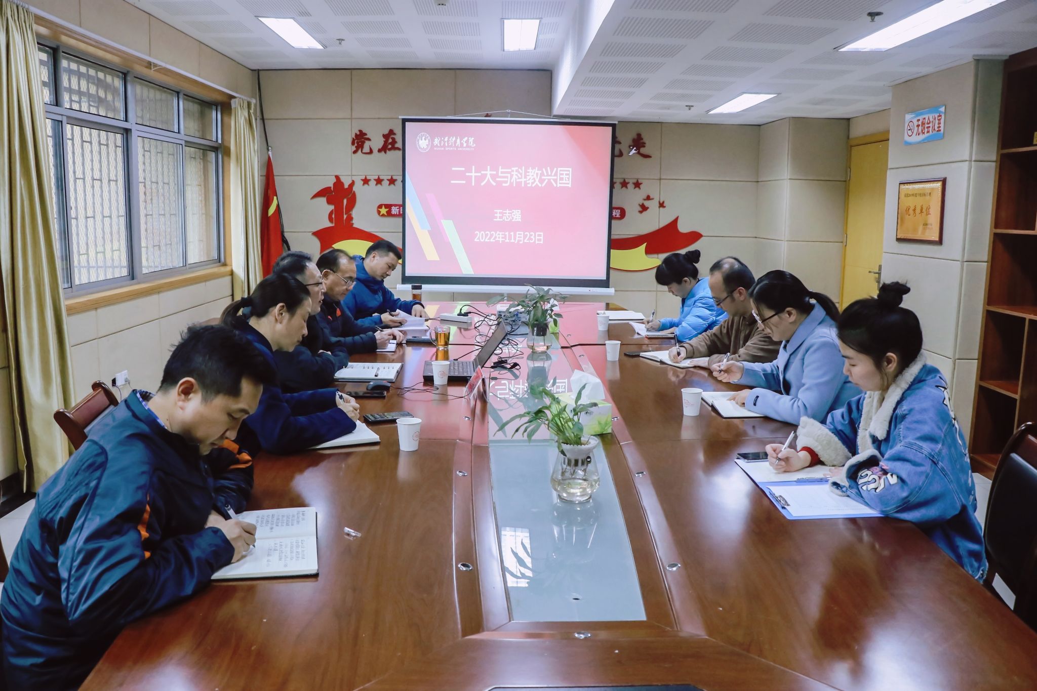(通讯员 汪凌云)11月23日下午,党委常委、副校长王志强于体育馆一楼训练竞赛处会议室以“党的二十大与科教兴国”为题宣讲党的二十大精神。教务训竞党支部全体党员聆听宣讲。