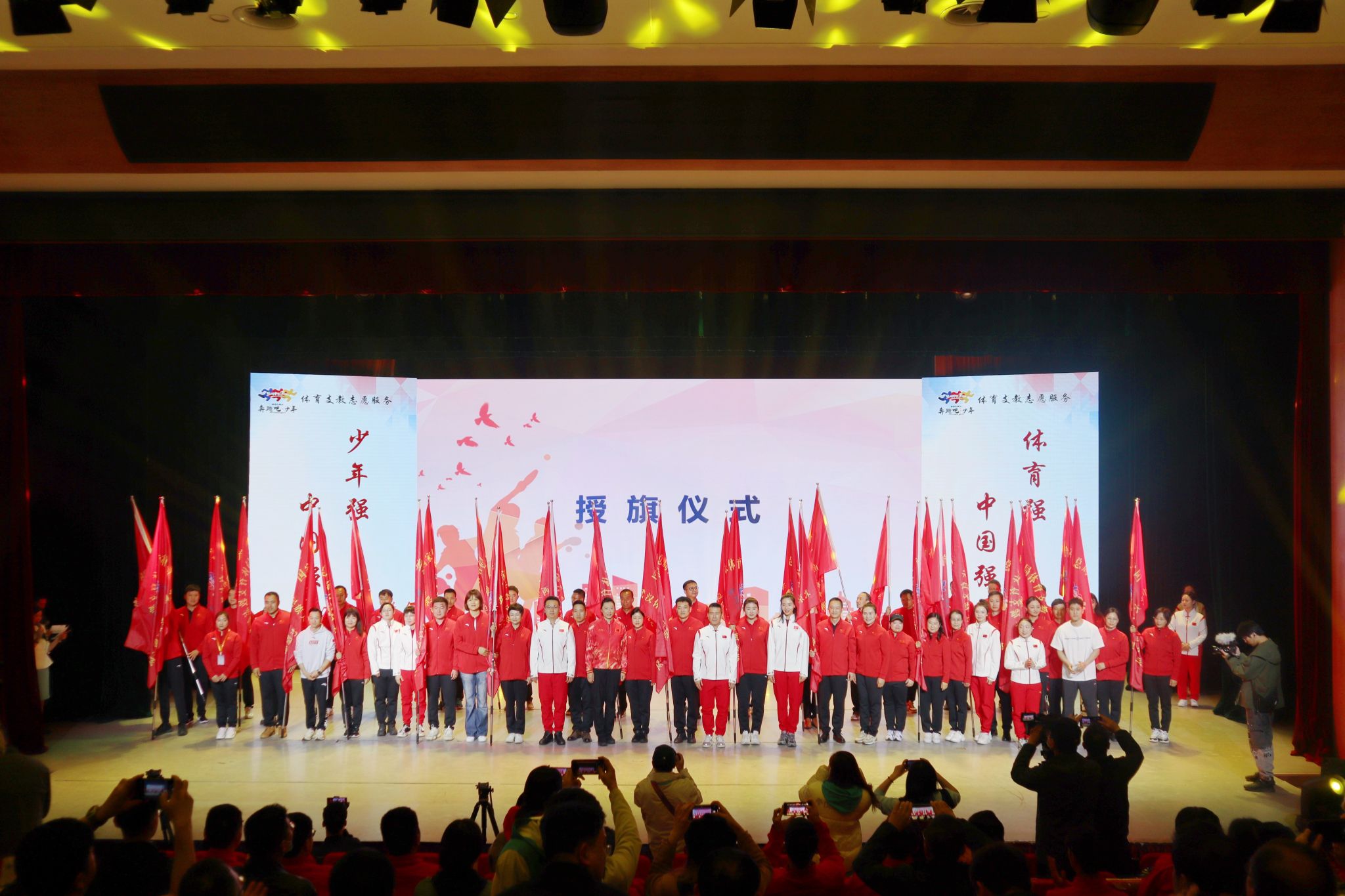 现场的体育冠军为本期参与体育支教志愿服务的35所高校授旗。
