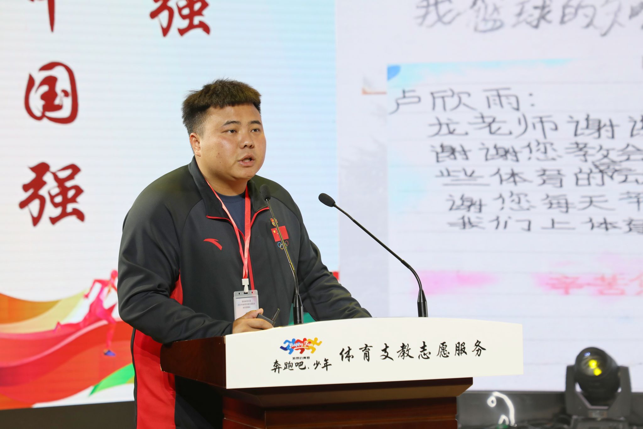 往期体育支教志愿者代表、武汉体育学院毕业生龙文雨上台发言。他讲述了自己2021年作为武汉体育学院体育支教志愿服务队队长前往陕西平利支教的志愿服务经历,分享了自己的心得体会。