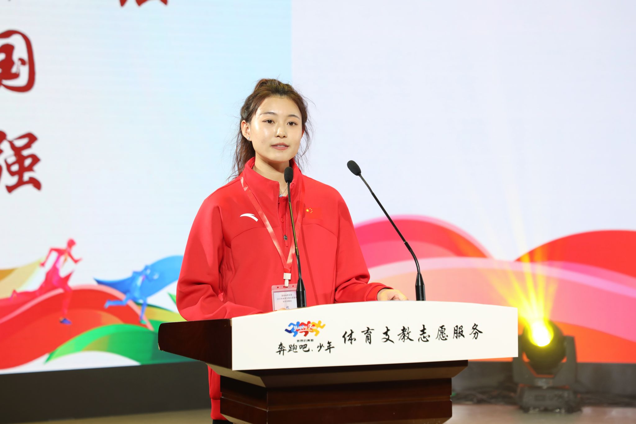 本期体育支教志愿者代表、天津体育学院的李佳庆同学作表态发言,她表示,自己将弘扬志愿服务精神,用爱心浇灌梦想,用体育绘就未来,在体育支教志愿服务中绽放绚丽的青春之花。