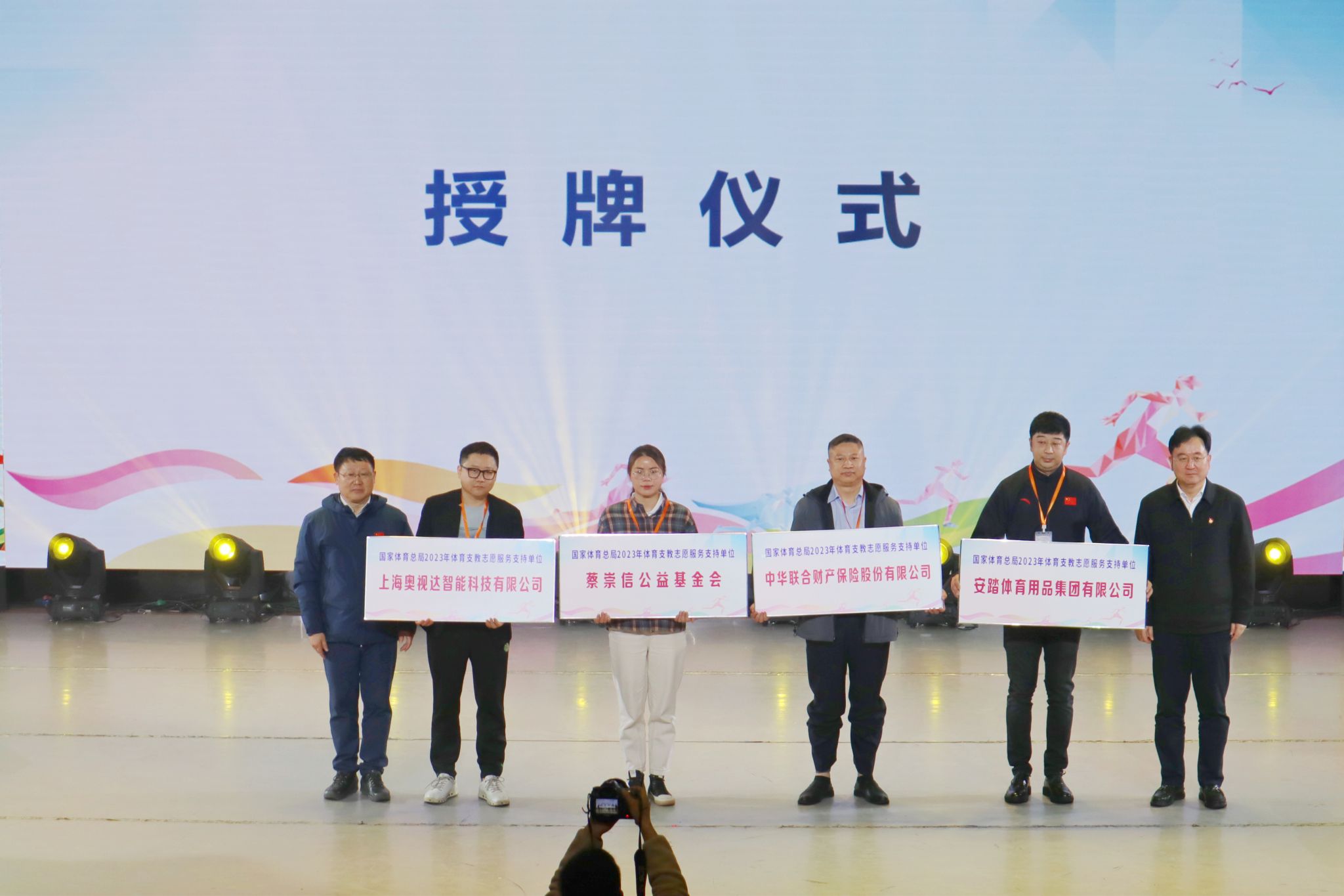姜庆国、吕万刚为安踏体育用品集团有限公司、中华联合财产保险股份有限公司、蔡崇信公益基金会、上海奥视达智能科技有限公司等四家体育支教志愿服务支持单位授牌。